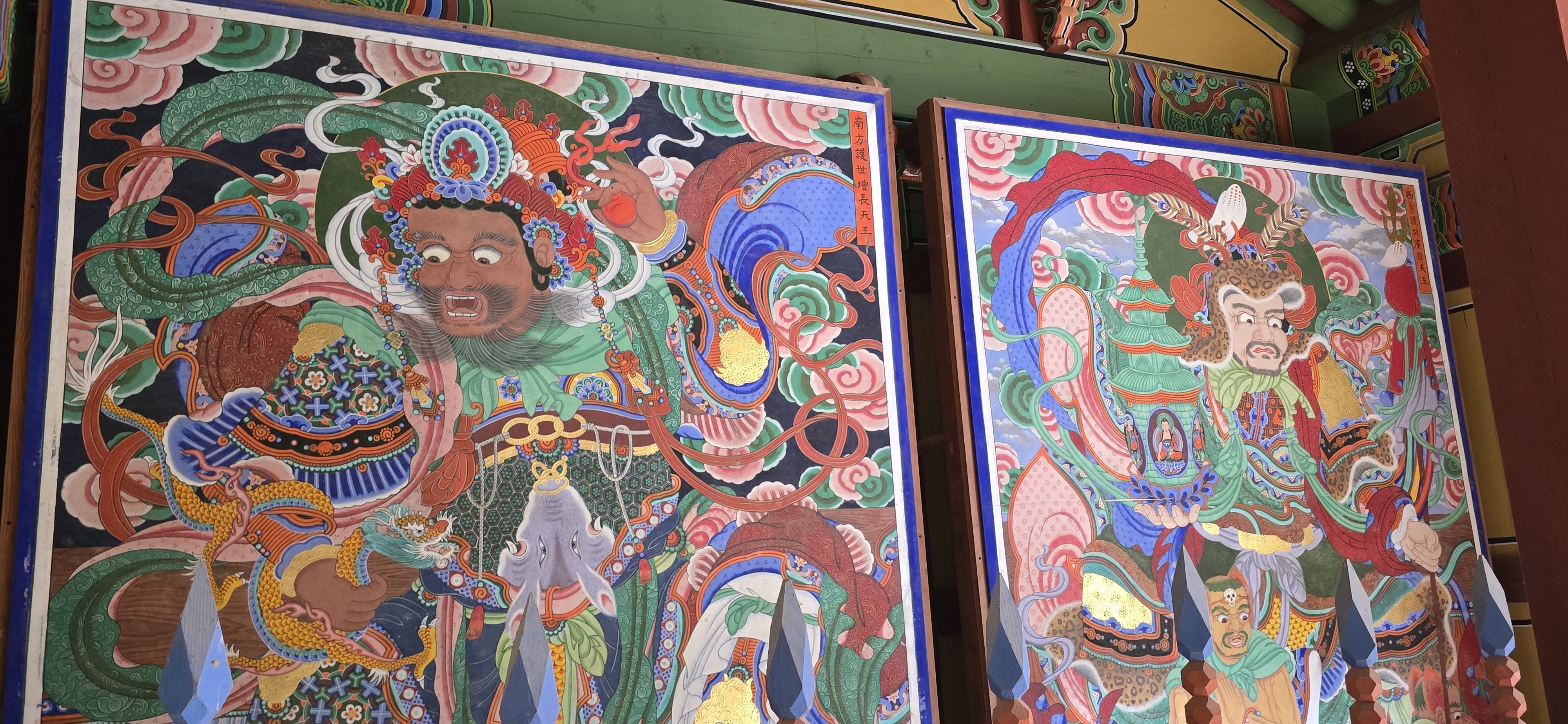 불회사에 들어서는 입구입니다. 입구 좌우측에는 여러 탱화들이 있습니다. 신을 표현하는 탱화와 불회사의 전경을 그린 것과 인도 고승 마라난타가 해로를 통해 들어오는 모습도 볼 수 있습니다.