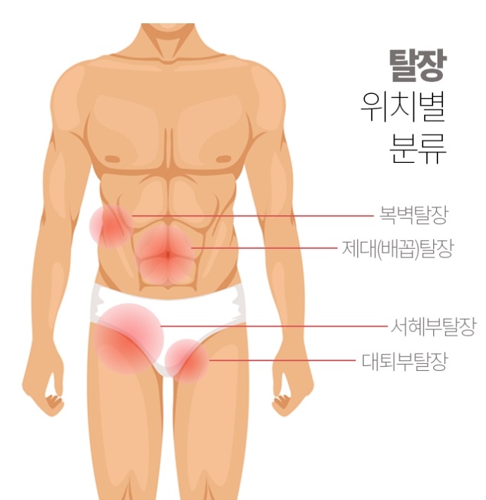 탈장은 생긴 부위에 따라 서혜부 탈장, 대퇴부와 아랫배가 만나는 부위에 생기는 대퇴 탈장, 수술 상처부위에 생기는 반흔 탈장, 배꼽 부위에 약해진 부분을 통해 발생하는 제대 탈장 등이 있습니다.