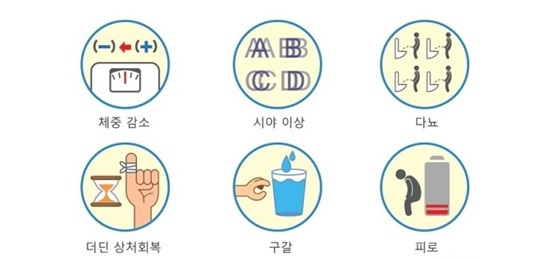 약한 고혈당에서는 대부분의 환자들이 증상을 느끼지 못하거나 모호해서 당뇨병이라고 생각하기 어렵습니다. 혈당이 많이 올라가면 갈증이 나서 물을 많이 마시게 되고, 소변량이 늘어 화장실을 자주 가게 되고 체중이 빠지게 됩니다. 오랜 기간 고혈당 상태가 유지되면 신체에서 여러 합병증이 발생하는데, 대표적인 것이 망막병증(실명할 수 있습니다.), 신기능장애(신기능 저하로 심할 경우 투석이 필요합니다.), 신경병증(저림, 통증)이고, 심혈관계 질환의 위험이 커지게 됩니다.