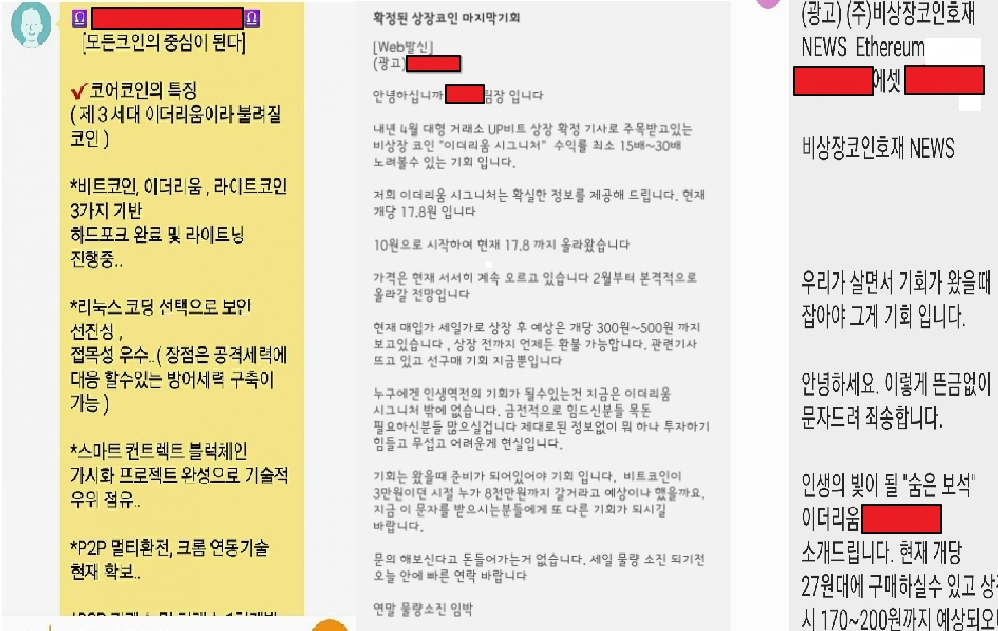 국내 대형거래소 상장을 얼마 남지 않았다며 공모가보다 많이 오른 상태이며 시세대비 싸게 매수할 수 있다며 문의할 것을 안내합니다. 예를 들어 공모가는 500원인데 현재 시세는 5,000원이며 이보다 싼 2,000원에 매수할 수 있는 기회를 제공한다고 하면서 물량이 얼마 없으니 빠르게 문의하고 매수할 것을 안내하는 방식입니다.