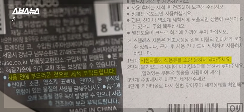 기업들이 스테인레스제품을 출시하기 전에 연마제를 제거하면 좋겠지만 의무규정이 아니기에 제거하지 않습니다. 또한 업체 입장에서도 깨끗하고 광택 있게 유지해야 제품이 팔리기 때문에 연마제를 제거하지 않고 있습니다.