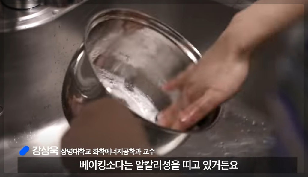 2. 베이킹 소다를 넣고 한번 더 닦아줍니다. 베이킹소다는 알칼리성 물질로 스테인레스 틈에 끼여 있는 탄화규소(연마제)를 녹여내어 제거해 줍니다.