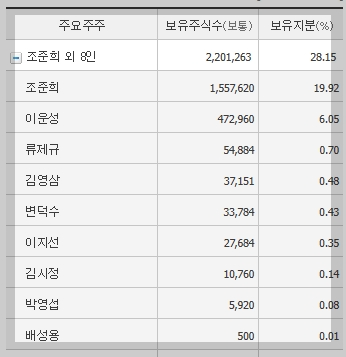최대주주 측 지분은 대표이사인 조준희 외 8인으로 28.15%의 지분을 갖고 있습니다.