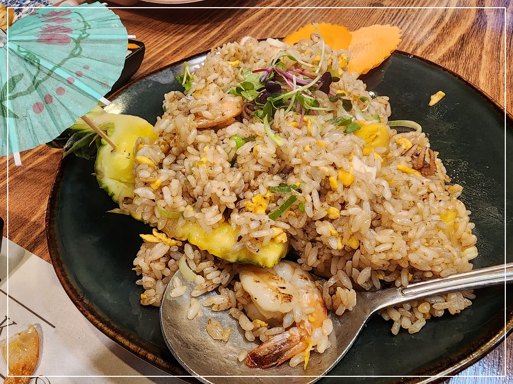 아이가 먹을 파인애플볶음밥입니다. 파인애플 껍데기에 자그마한 우산이 꽂혀있네요.