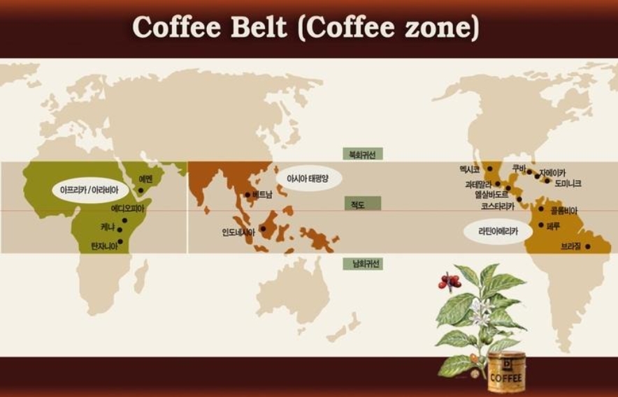 이후 제국주의 강대국들이 아프리카와 동남아, 북중미 식민지에 커피를 대량으로 재배하면서 전 세계에 알려지게 되었고 오늘날에 커피가 제배되는 지역을 '커피벨트'라 불리게 되었습니다.
