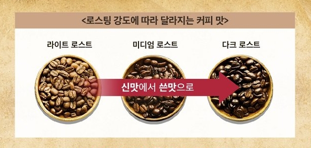 원두 로스팅이 짧을수록 산미가 잘 느껴집니다. 오랜 시간 로스팅을 할수록 신맛에서 쓴맛(고소함)으로 맛이 바뀝니다.