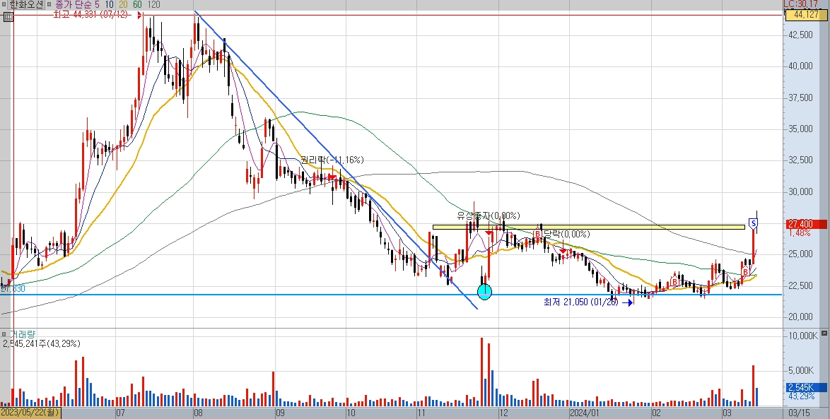 이전 고점대인 27,000원대, 240일선에서 저항을 받을 것을 예상하고 자동감시주문을 걸어두었고, 매도 되면서 약 7%의 수익을 챙겼습니다.