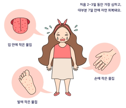 여름과 가을철에 흔히 발생하며 입 안의 물집과 궤양, 손과 발의 수포성 발진을 특징으로 하는 질환입니다.