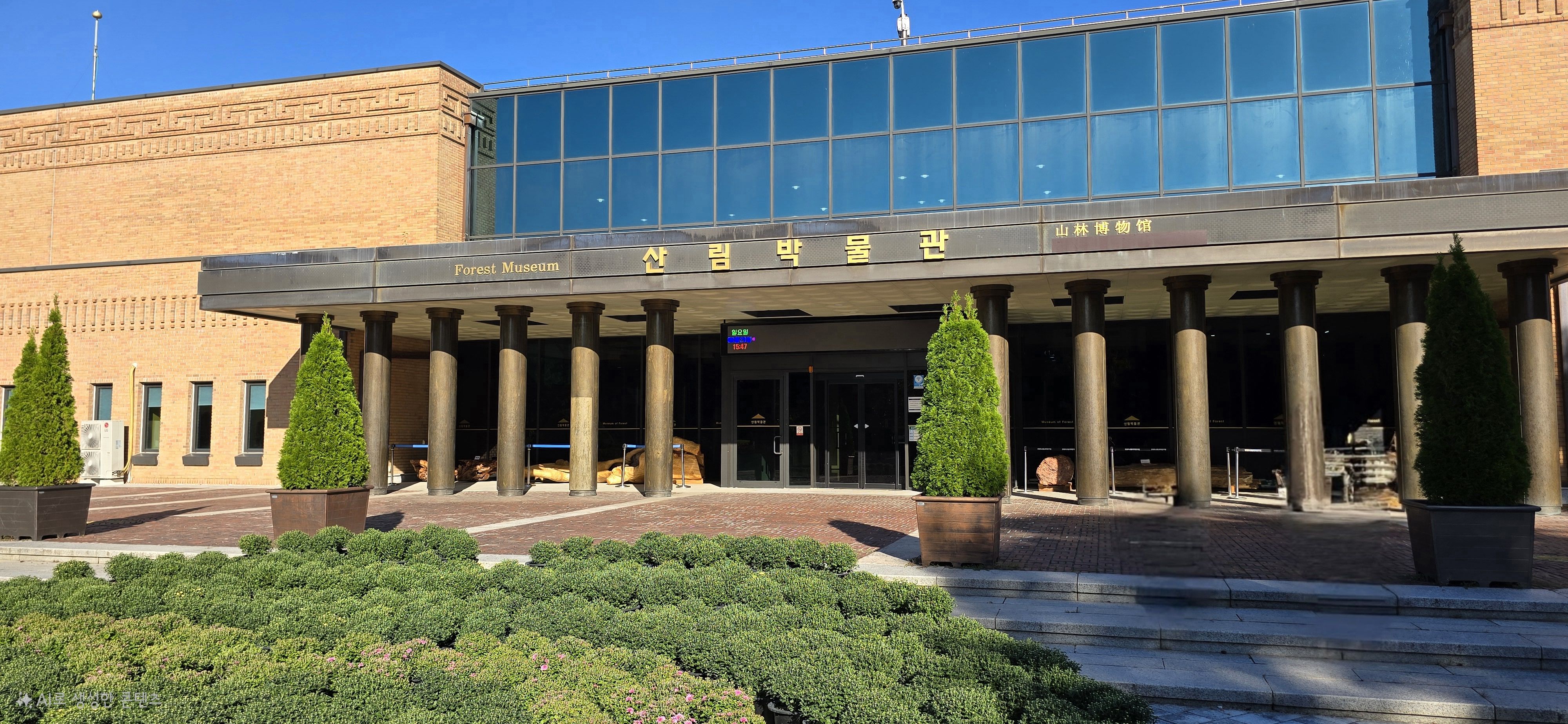 산림박물관 입구에 국화로 만들어진 화분으로 이루어져 있습니다. 벤치가 놓여 있는 것으로